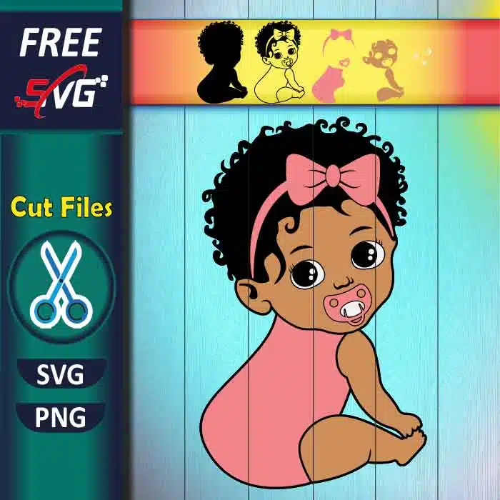 Free baby girl SVG featuring adorable African American newborn with pacifier. Perfect layered cutting file for nursery decor, baby shower crafts, and family projects.