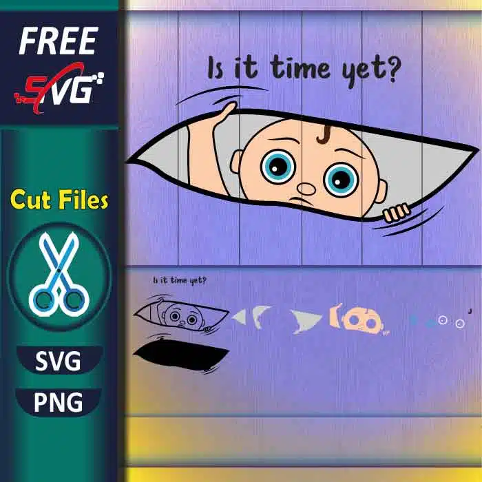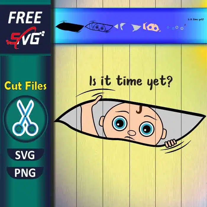 Free Pregnant SVG “Is it time yet?” baby design for Cricut! Adorable waiting baby cut file perfect for maternity shirts, baby shower & countdown decor.